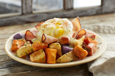 A perfect breakfast medley combining tender oven roasted potatoes, black forest ham and a poached egg.