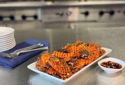 Spicy Maple Sweet Waffle Fries topped with braised short rib and drizzled with spicy bourbon maple syrup